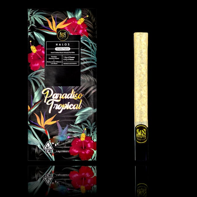 The Paradiso Tropical Halo is a dreamy blend of our fragrant, exotic Paradiso flower with our bittersweet, refreshing Honey Lemon Hibiscus Live Rosin. A light floral note greets you upon inhalation, while the slow burn of the concentrate adds layers of fruit and assorted citrus, culminating in an airy, honeyed exhale that evokes the flavors of island life - transporting you on a one-way ticket to tropical paradise. Halos are a refined and indulgent smoking experience meant to be savored slowly.