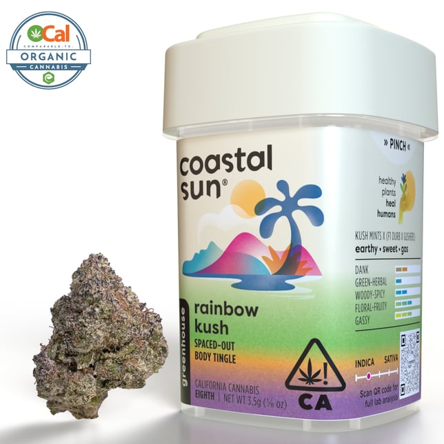 Rainbow Kush is an award-winning genetic cross of Kush Mints, F1 Durb, and Gushers. This savory blend boasts hints of funky cheese and creamy diesel, balanced with a light maple finish. Known for its potency, it may induce a spaced-out mental state and a tingling bodily sensation, ideal for a serene lazy night in.