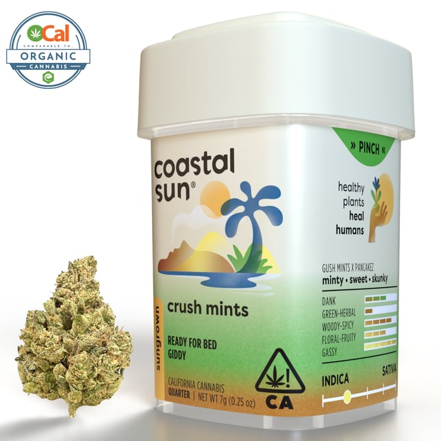 Crush Mints is a delightful cross of Gush Mints and Pancakez. Its aroma and flavor profile is distinctly gassy, highlighted by strong mint and a sweet, pungently skunky finish. Users note that the experience often includes lighthearted giggles, slowly followed by a relaxed body and sweet dreams. It may be best enjoyed by those seeking a happy, restful slumber after a demanding day.