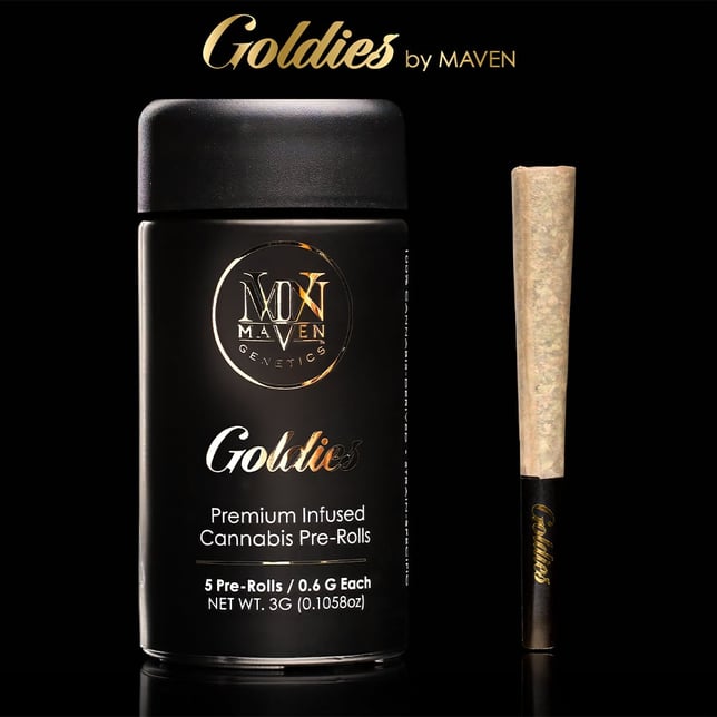 Goldies are Maven’s premium infused cannabis pre-rolls — crafted for connoisseurs who demand purity, potency, and authenticity. Each Dirty Laundry Goldies Infused Pre-Roll 5-Pack contains five 0.6g joints made exclusively from our award-winning Dirty Laundry strain indoor flower, ultra-refined cannabis oil, and kief. Every element is 100% cannabis-derived, strain-specific, and terpene-rich — designed to deliver a clean, powerful, and flavorful smoke.