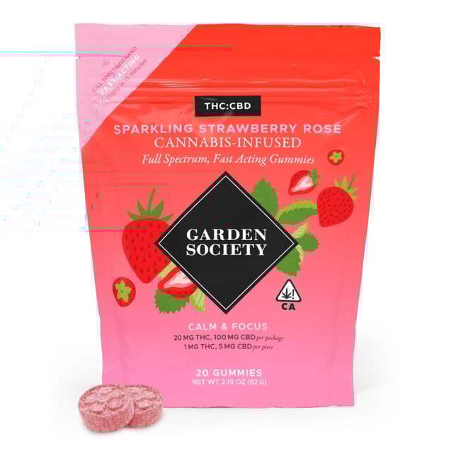 Garden Society Calm & Focus Sparkling Strawberry Rose gummies are inspired by the delicious flavors of wine country, our Sparkling Strawberry Rosé gummies are infused with a high-CBD strain of cannabis for Calm & Focus. Enjoy the juicy flavors of a ripe summer strawberry, complemented by the light, fruity flavors of sparkling rosé . Using proprietary, fast-acting technology, our full-spectrum edibles will provide a desired effect in around 15 minutes! Made with uncompromising quality ingredients. 10mg CBD per serving, 1mg THC per serving (two pieces).